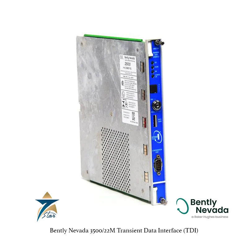 The 3500/22M Transient Data Interface (TDI) provides the primary interface between a Bently Nevada 3500 machinery protection rack and System 1 condition-monitoring software. Installed in the left side of the rack, the TDI collects static values, dynamic overall data, and high-resolution transient waveforms from installed modules, timestamps events, and serves them over Ethernet for diagnostics, reporting, and long-term analysis—without interrupting protection functions.