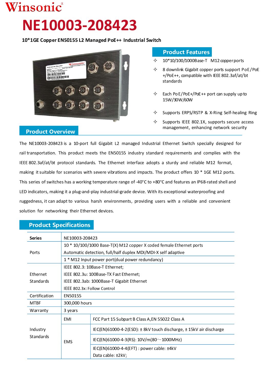 The Winsonic NE10005-008423 is a rugged EN50155 M12 PoE++ managed Ethernet switch engineered for rolling stock, road vehicles, ports and any cabinet exposed to shock, vibration, dust and moisture. With sealed M12 X-coded copper interfaces, wide temperature performance and a resilient power design, it safely powers and connects edge devices such as IP cameras, access points, HMIs and sensors. Management gives you VLANs, QoS, security and ring protection—without sacrificing plug-and-play deployment.